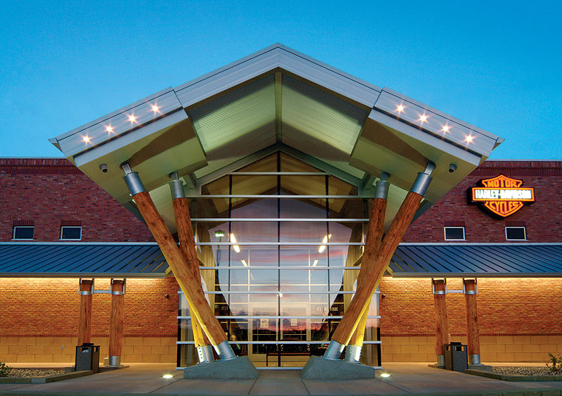 Beartooth Harley Davidson/Buell Jones Construction and its team of designers and subcontractors have created a timeless look integrating the classic Harley style with natural colors and elements inspired by Montana’s Yellowstone Valley. Combine the classic style with a prime location that embraces the connection to the open road and one has a destination that doesn’t miss a detail of the Harley mystique, right down to the signature Harley-orange stripes in the parking lot and front support columns that replicate the bikes’ distinct forks.