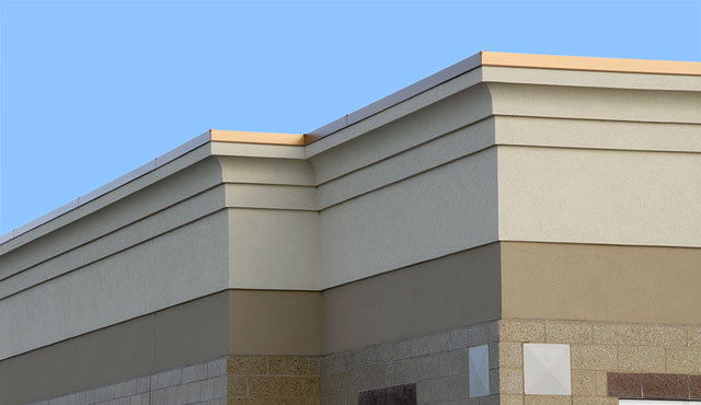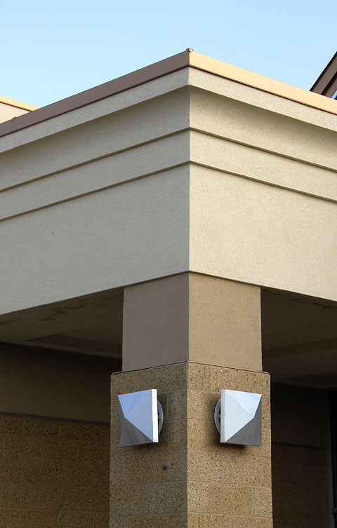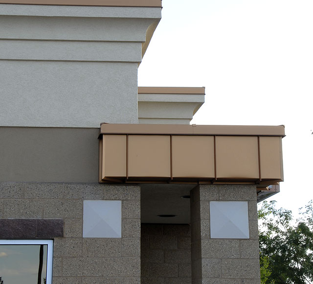 Copper-coated metal roofing and flashing combined with custom, integral colored masonry units give the building a unique and sophisticated look with an Exterior Insulation Finish System for exterior claddings.