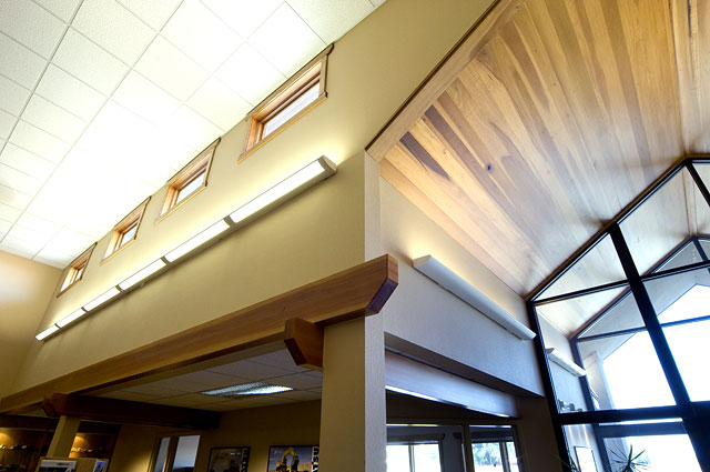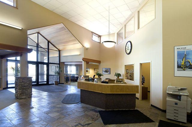 Details continue inside with clear maple doors & trim, custom designed work stations and a conference room with high tech audio/visual performance systems. The service area is heavy-duty with 8" thick, heavily reinforced concrete floor slabs and an embedded train rail for maintaining track type equipment. A 10 ton traveling bridge crane covering the entire shop area helps with the heavy lifting.