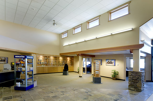 Modern Machinery teamed up with Jones Construction for a robust new heavy equipment sales and repair facility. 30' insulated sandwich concrete tilt-up panels form the exterior walls, while natural rock veneer with synthetic plaster adds accents. The copper roof system on the office areas completes the overall look.
