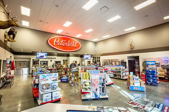 Montana Peterbilt is located on an 11-acre site with no city utilities available. All utility needs are supported with onsite systems, including fire suppression water storage with fire pumps, special EPA sanitary sewer and storm sewer systems, and reverse osmosis domestic water supply. The building structure is a pre-engineered GARCO metal building frame with standing seam metal roofing and Kynar finish polymer wall panels. All exterior envelope components exceed the Model Energy code for R-Values. LED and motion sensor lighting have been incorporated throughout as well as new truck display areas with LED exterior lighting. 20-ton overhead cranes cover the entire shop area and a 10-ton exterior crane is located onsite for off loading new trucks. A special densifier/hardener floor finish system was utilized in all areas of the facility. The customer area features a reclaimed 50 year old “Peterbilt” sign from the original Peterbilt shop.
