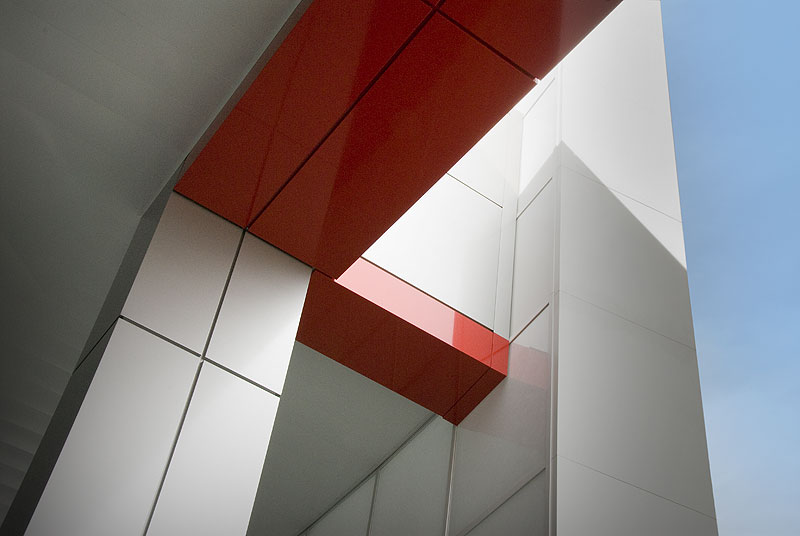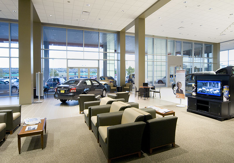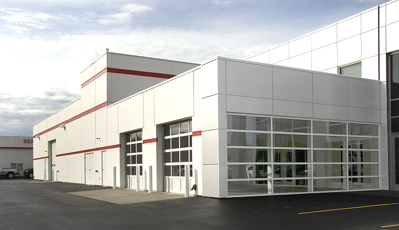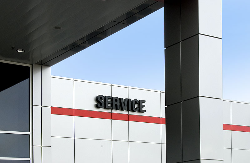 Once inside, customers are treated to lounge areas with plush couches, flat screen TVs and coffee kiosks. Insulated tilt-up concrete panels house the 20 state-of-the-art technician stations and an innovative parts department which maximizes space using a 2-story storage area with aluminum modular mezzanines.